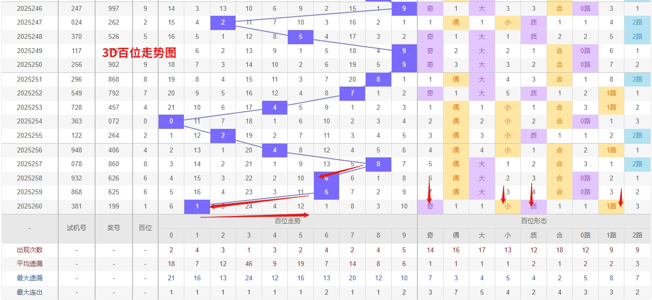 福彩3D百位分析:第2025260期百位开出号码1属于小奇数,从上面百位走势图上可以看出近100期大小比约为52:48奇偶比约为53:47。近期数据还是比较极端的符合文章开头介绍的求均衡规律非等量现象。但这种均衡不会持续最终会被偏态运行打破,然后循环往复。但短期内大小相差5点,大数过热小数有回补需求本期个人认为走小数的概率更高。上期百位落号“1”号球,在百位号码开出1路号码1后向小数方向走出5个振幅。那么通过分析上期百位落位号码分析,号码走出5个振幅,号码走为小奇数,开出1路号码1。通过对百位落号趋势来分析,百位号码落位前端,通过对近10期的走势来看百位号码大小交替频繁走2期大数又走3小数,最近大数比较强势,本期有走向大数号码的概率。那么本期我们在对百位号码进行分析时我个人的考虑百位号码会走出大数号码球,近期3D百位走势的观察,号码呈现出明显的冷热分化态势。其中,数字9的热度尤为突出,连续多期开出,形成强劲的热号趋势,这种强势状态短期内仍有延续的可能,须给予重点关注。然而,物极必反,在紧盯热号的同时,必须高度警惕其热度达到顶峰后可能出现的转折与回调。另一方面,数字3和7则持续低迷,遗漏期数较长,已进入典型的冷号区间。从概率均衡的规律来看,冷号不会一直沉寂,其回补反弹的动能正在不断积聚。我们在百位关注的重点在34789这5个号码球上,百位号码近期奇偶切换频繁,1号球码属于1路号码奇数,现奇数开出过多有继续向奇数的趋势。所以福彩3D第2025261期百位看好34789。本文由彩虹多多钱是生命动力所著,请勿转载