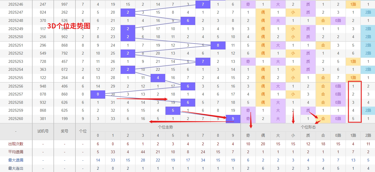 福彩3D个位分析:第2025260期个位开出号码9属于大奇数后端,从以上个位走势图中可以看出近100期的大小比约为54:46奇偶比约为51:49大小奇偶数据上有点差异有需求但不是太明显,不太好看这时就要借助连线走势和遗漏数据来帮助我们缩水号码。上期个位落号“9”大奇数0路号码球,号码开出了4振幅,连续多期的大振必被小振幅取代幅符合我们的预期,那么本期我们在个位考虑振幅走势走前依然要转变思路考虑大振幅,具体考虑(1-6)个振幅是我们主要的方向,那么在对个位落号情况进行系统的分析时我们可以明显的看到个位号码走势呈现大范围震荡,尤其是在号码的落位特点上表现的尤为突出,那么本期我们在个位分析时就要注意号码的风险,避免出现踏空。近期3D个位走势分析,数字0表现非常活跃,热度持续攀升,呈现出明显的强势特征,短期内极有可能连续开出,需作为重点追踪对象。然而,在热号炙手可热之际,也必须清醒认识到连开之后随时可能出现的降温风险。另一方面,数字1则陷入长期遗漏的冷态,从概率均衡的规律来看,冷号不会一直沉寂,其反弹回补的势能正在不断增强,尤其需要重点设防。因此福彩3D第2025261期个位看好01458。本文由彩虹多多钱是生命动力所著,请勿转载