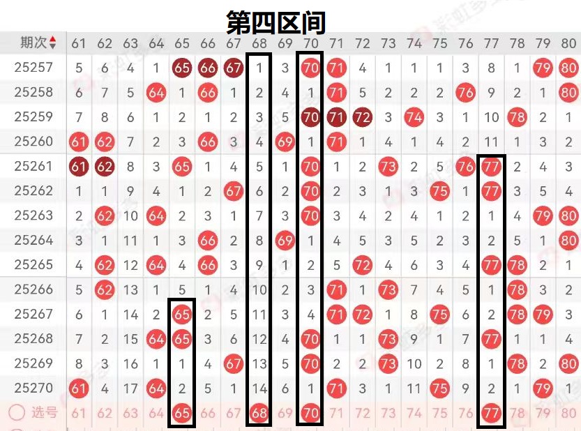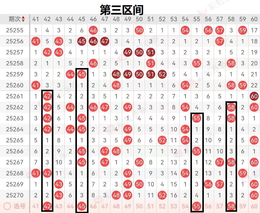 上期第三区间开出了(43 48 49 52 60)五个号码球,上期三区间开出热态五码落位,上期三区号码落位处于区间的前后两端。区间前端独码43号码球开出,区间后端独码60号码球开出。那么通过对三区间的整体分析来看我认为接下来三区间号码在区间走出震荡后形成下行落号,区域会走出小范围的震荡。那么大家一定要注意区间号码的冷调整趋势,通过对三区间近期号码的分析来看号码走出温态调整的可能性最大。那么通过分析来看三区间在近期会继续出现走势分化的趋势,因此我们在对三区间进行分析后得出,未来我们要重点考虑近期回补号码球更为合理。