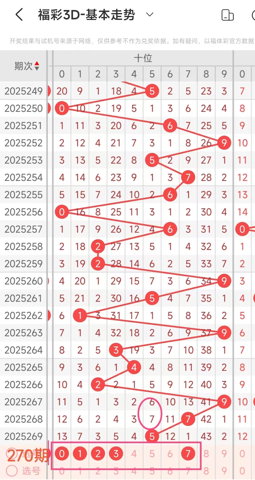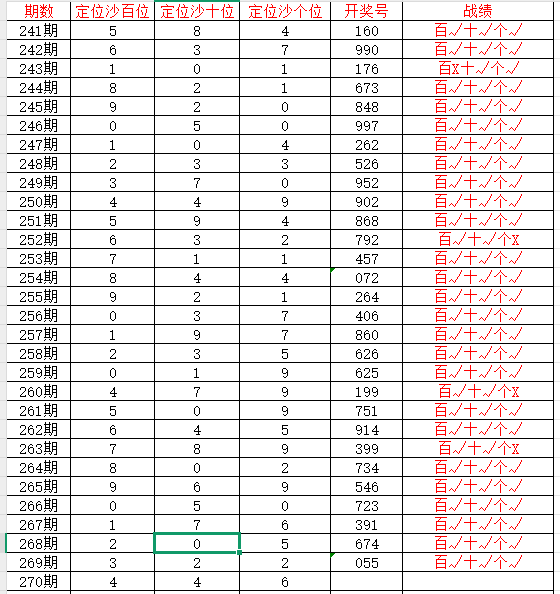 2、当十位开出5后下期开出:9138229071,经统计0号出1次、1号出现1次、2号出现2次、3号出现1次、4号出现0次、5号出0次、6号出现0次、7号出现1次、8号出现1次、9号出现2次。观察发现269号出现靠前优先选
