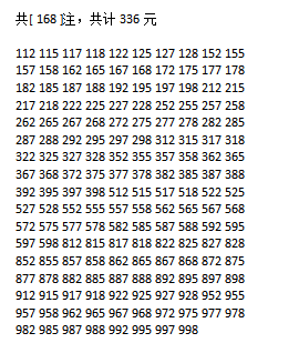 经统计0号出现3次、1号出现7次、2号出现4次、3号出现7次、4号出现5次、5号出现6次、6号出现5次、7号出8次、8号出现7次、9号出现12次.统计后出现次数靠前的数字作为我们的备选号码.其号码有91378等