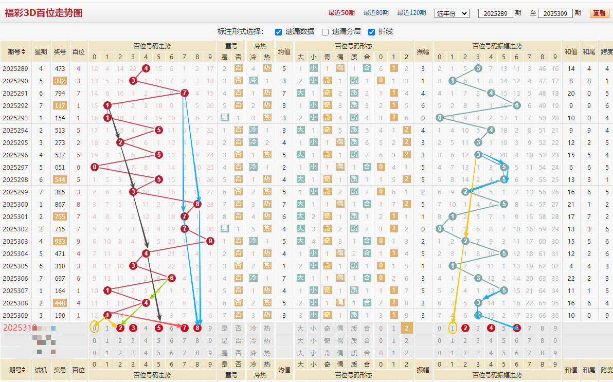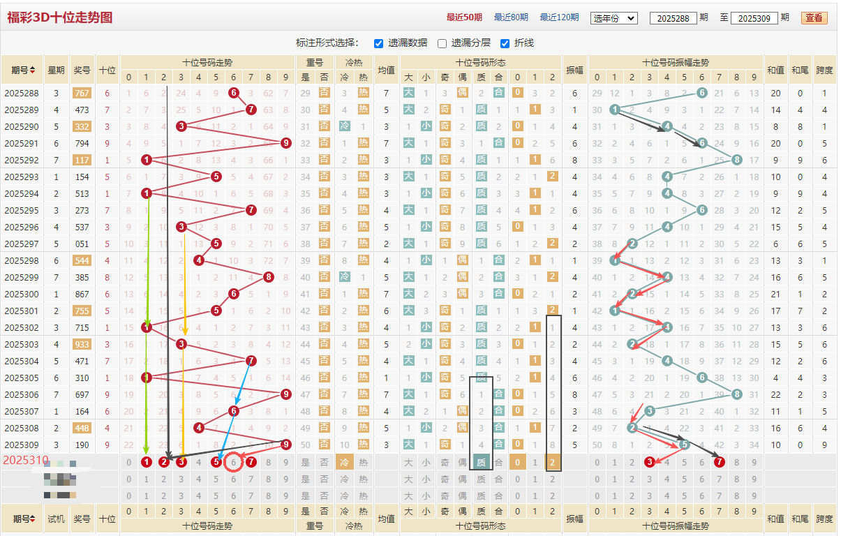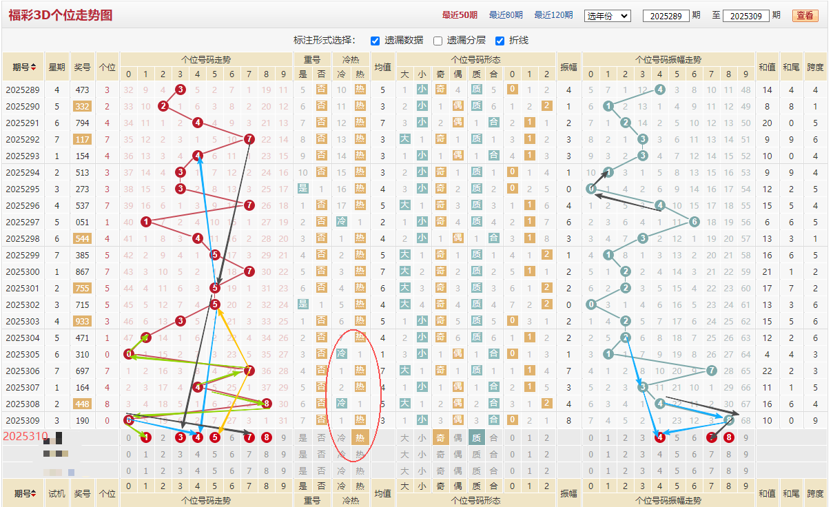 个位近期走势:7/1/4/5/7/5/5/3/1/0/7/4/8/0,综合看奇数9期本期重点以质数为主,如上图振幅蓝色线234/484同样走势对应数字4,黑色线487/410对应数字7,左边蓝色线4/5/4,黄色5/7/5,黑色线7/5/3都是等隔下来,从冷热角度观察,本期重点看热号排除269 ,综合上图分析个位推荐:134578