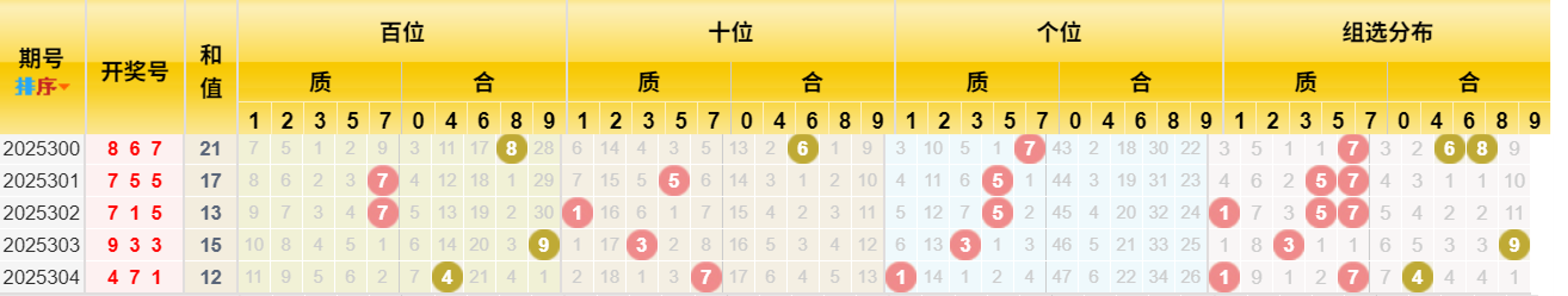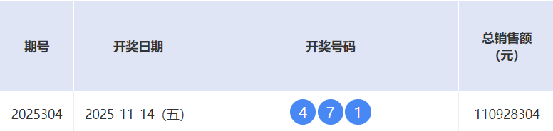 上期(第2025304期)开奖号码为 4, 7, 1。其中,开出2枚质数号码(7, 1),开出0个重号,开出0组连码。和值为12,跨度为6。
