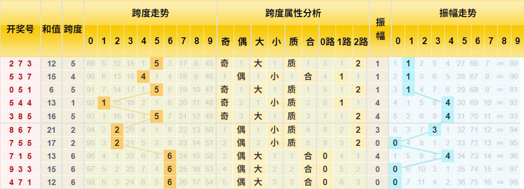 近10期跨度值分别为【5, 4, 5, 1, 5, 2, 2, 6, 6, 6】,中小跨度(2-6)占据绝对主导。本期预计此趋势将延续,关注跨度范围在3至5之间。