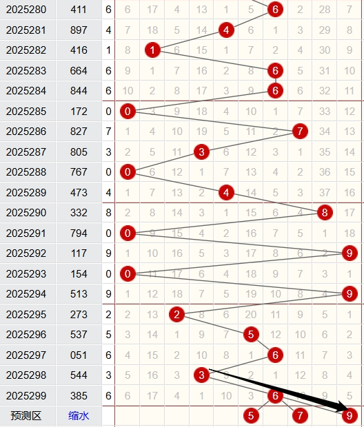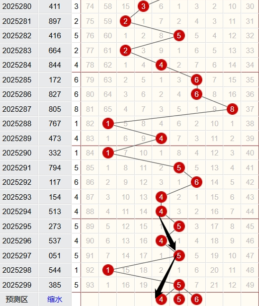 上期跨度为5,近5期跨度开出情况:第25294期开出4,属于偶数,1路号码,金属性;第25295期开出5,属于奇数,2路号码,土属性;第25296期开出4,属于偶数,1路号码,金属性;第25298期开出1,属于奇 数,1路号码,水属性;第25299期开出5,属于奇数,2路号码,土属性;