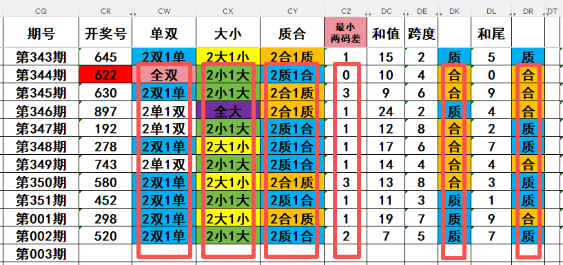 2,目前开奖号十位号码球11天当中,质数(12357)开出了5次,合数(04689)开出了6次,本期重点关注开奖号十位号码球质数的回补!