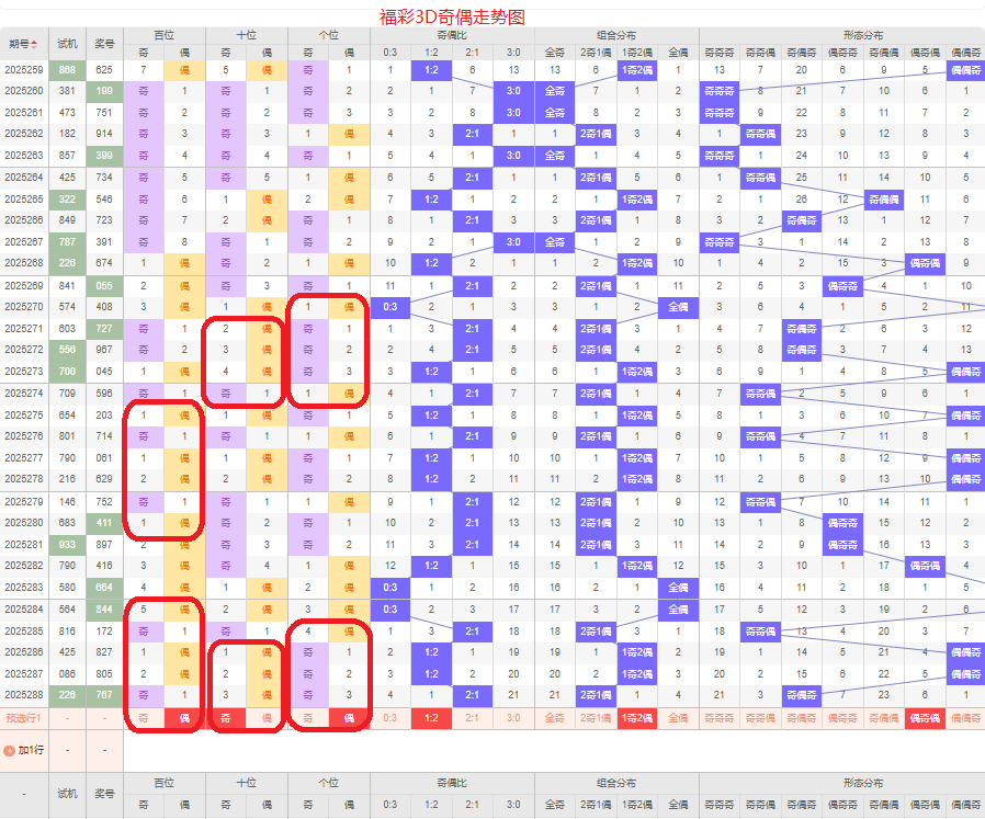 上期奇偶比是2:1,两奇的号码组合方式,从近五期的奇偶数出现情况看,奇数出现6次,偶数出现9次,奇数号码出现较少,本期侧重两偶的号码组合,侧重偶奇偶或偶偶偶的号码组合方式,根据奇偶形态做五码定位02468/13579/02468或02468/02468/02468