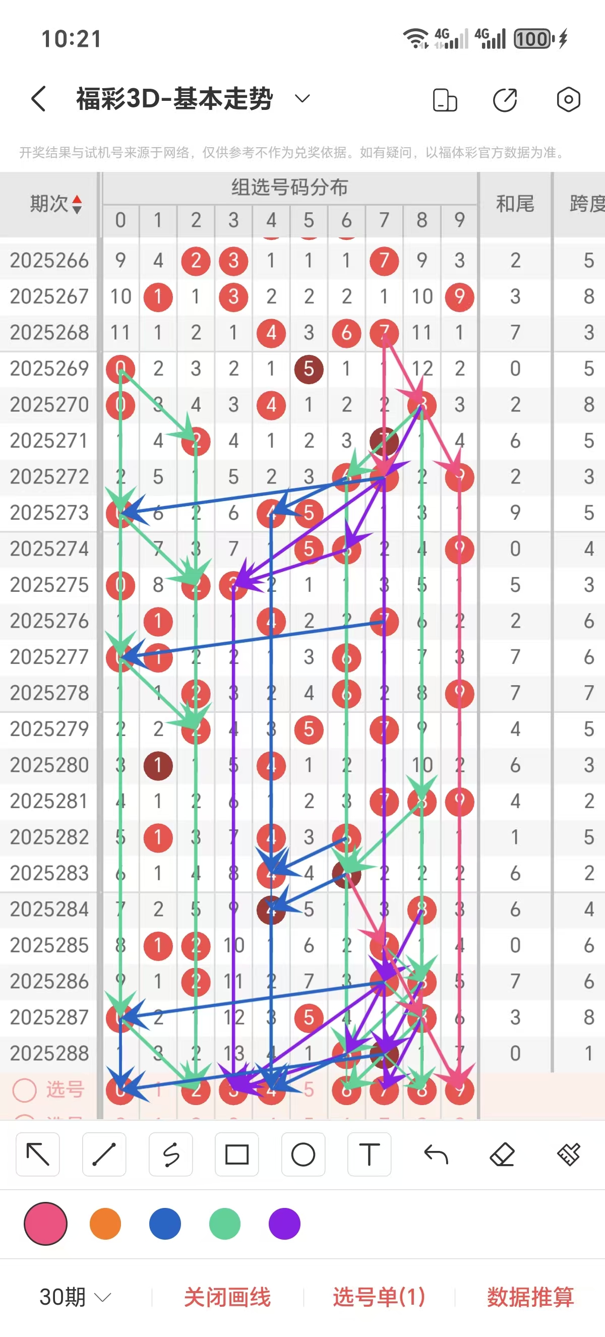 跨度通常情况下在五期之内重复一个跨度的概率很高,近五期重复了6的跨度,近五期跨度为4/6/6/8/1,近期01路的跨度较热,上期是1路的跨度,本期要侧重跨度以3/6跨为主的号码组合。可以从跨度方面选择相应的双胆码组合,双胆码的选取要根据近期和历史的走势进一步的分析选取。