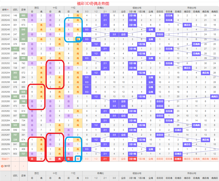 上期奇偶比是2:1,两奇的号码组合方式,从近五期的奇偶数出现情况看,奇数出现8次,偶数出现7次,奇数偶数号码出现较平均,本期侧重两奇的号码组合,侧重奇偶奇或奇偶偶的号码组合方式,根据奇偶形态做五码定位13579/02468/13579或13579/02468/02468