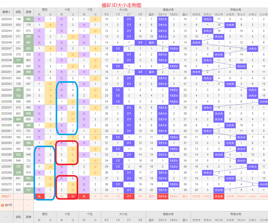 上期大小比为2:1,两大的号码组合方式,从近五期出现情况看,大号码出现8次,小号码出现7次,大小号码出现较平均,本期侧重两大的号码组合,本期百位侧重大号码,十位侧重小号码,个位要侧重看大,侧重大小大或者小小大的号码组合,根据大小做五码定位56789/01234/56789或01234/01234/56789