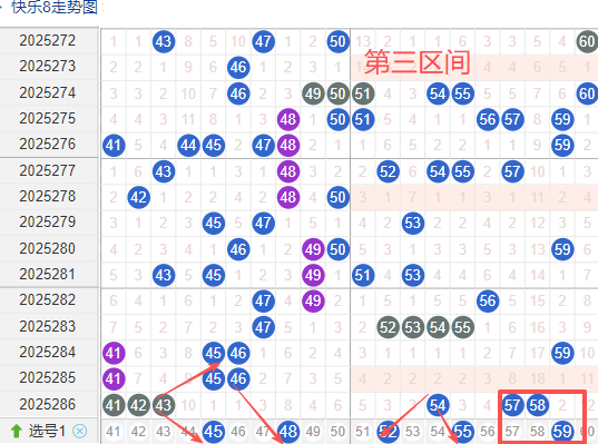 三区间开出了6个奖号(41.42.43.54.57.58)上期回顾三区开出6个奖号上期的三区间的奖号数量呈现一个递增的形态,4头回补3个号码,5头回补3个,本期先来看号码45近期出现频率相对来说还是很稳定的一个号码。说明其在近期的开奖中较热,号码48在近 30 期内出现次数不是很稳定,间隔上来说也不是很稳定。号码52近期比较温热的一个号码,通常间隔3-4期会出现一次,没有明显的连续出现态势,走势相对较温热,在整个第三区间的表现可以防守的。号码55近期走势相对近期比较温热,近期没有连续间隔落号的情况,活跃度近期处于温热态注意防守。