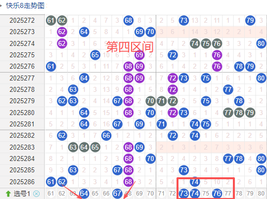 上期四区间开出了4奖号(61.62.68.74)上期的四区开4个奖号呈现了一个递减的趋势,6头开出的奖号3头,7头回补1个,先来看号码64在近 30 期内属于一个稳定号码但是本期是一个联动的落位码这个号码要注意防守,号码73有一定的间歇性活跃度稳定比如有时会间隔 4到5期就再次出现,近期整体出现频率比较热,近期还是要关注的.号码74活跃度近期也还不是很稳定注意参考的是一个温热号这里可以参考。号码76号近期的热度较冷整体不是很稳定注意参考。