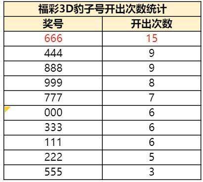 从上表我们可以看到,福彩3D自开售以来已经开出了74次豹子号,其中开出最多的是豹子“666”,本次福彩3D开出“666”的豹子号后,开出高达15次。“444”和“888”开出次数均为9次,并列第二。