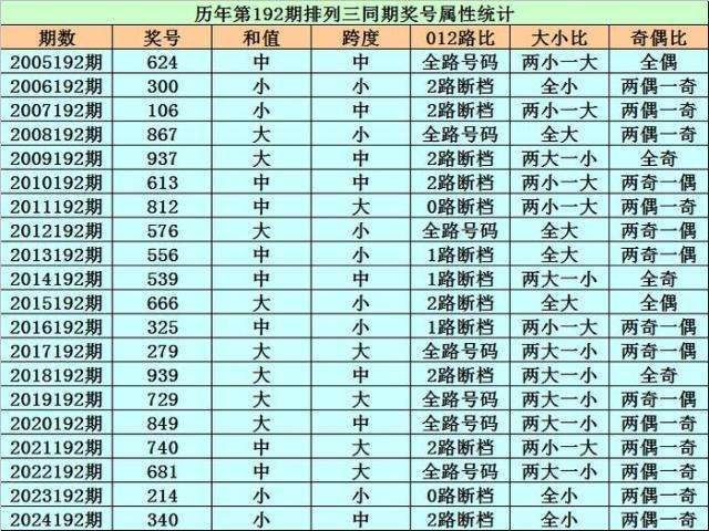 历史上第2025192期排列三已开出20期奖号了,历年同期奖号分别为:624、300、106、867、937、613、812、576、556、539、666、325、279、939、729、849、740、681、214、340,详细统计见下表: