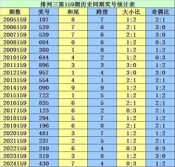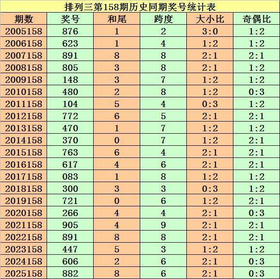 从2004年至今排列三已开出7282期奖号了,本期为排列三2025年第159期开奖,历史同期已出现20次奖号: