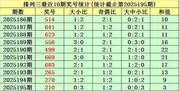 上期回顾:排列三第2025195期奖号为:210。奖号类型:组六,和值:3,奇偶比:1:2,跨度:2,大小比:0:3。