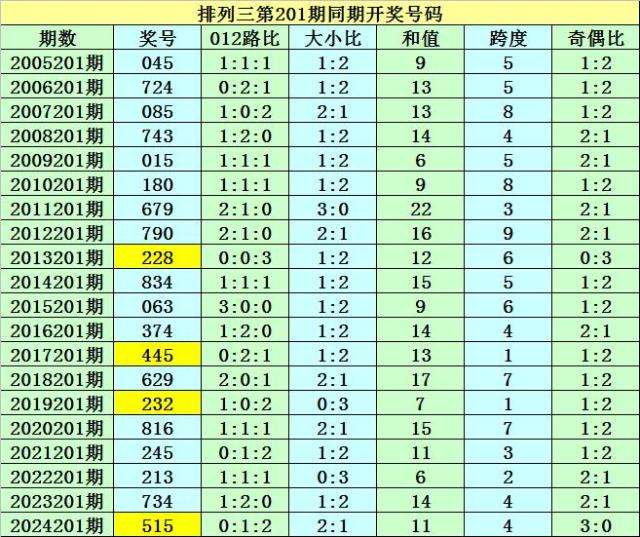 本期为排列三第2025201期开奖,开奖日期为:2025年7月30日,历史上排列三第201期已开出了20次奖号,历年同期开出号码分别为:045-724-085-743-015-180-679-790-228-834-063-374-445-629-232-816-245-213-734-515。