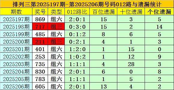 开奖回顾:排列三第2025206期奖号为:605,类型为组六,号码012路比为2:0:1,百十个位号码直选分别遗漏13期、4期和2期。