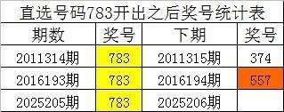 从上表统计可以看出,直选号码783开出之后,其下期奖号: