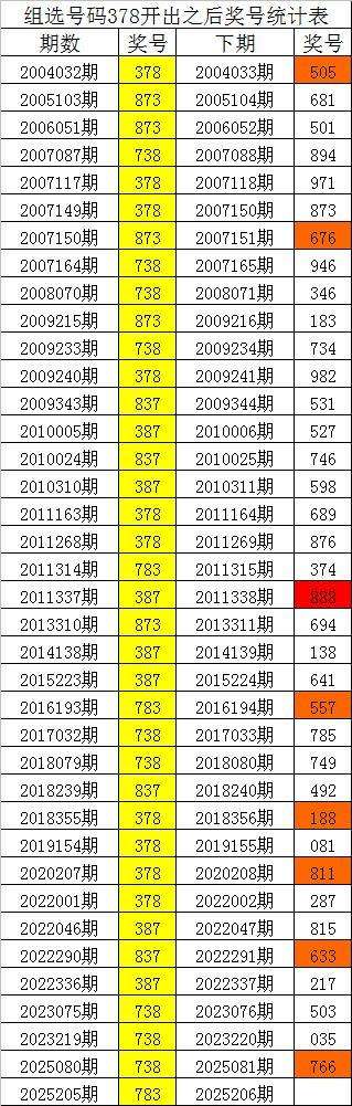 体彩排列三组选号码378历史上出现了38次,其下期奖号分别为:505、681、501、894、971、873、676、946、346、183、734、982、531、527、746、598、689、876、374、888、694、138、641、557、785、749、492、188、081、811、287、815、633、217、503、035、766,详细统计见下表: