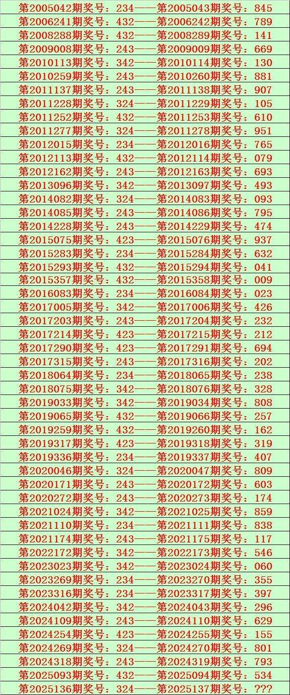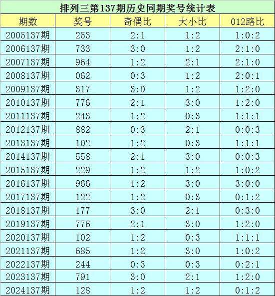 排列三第2025137期开奖日期:2025年5月27日,历史上第137期已开出了20次奖号,历年同期号码分别为:253、733、964、062、317、776、243、882、102、558、229、966、122、177、776、102、685、244、791、128。