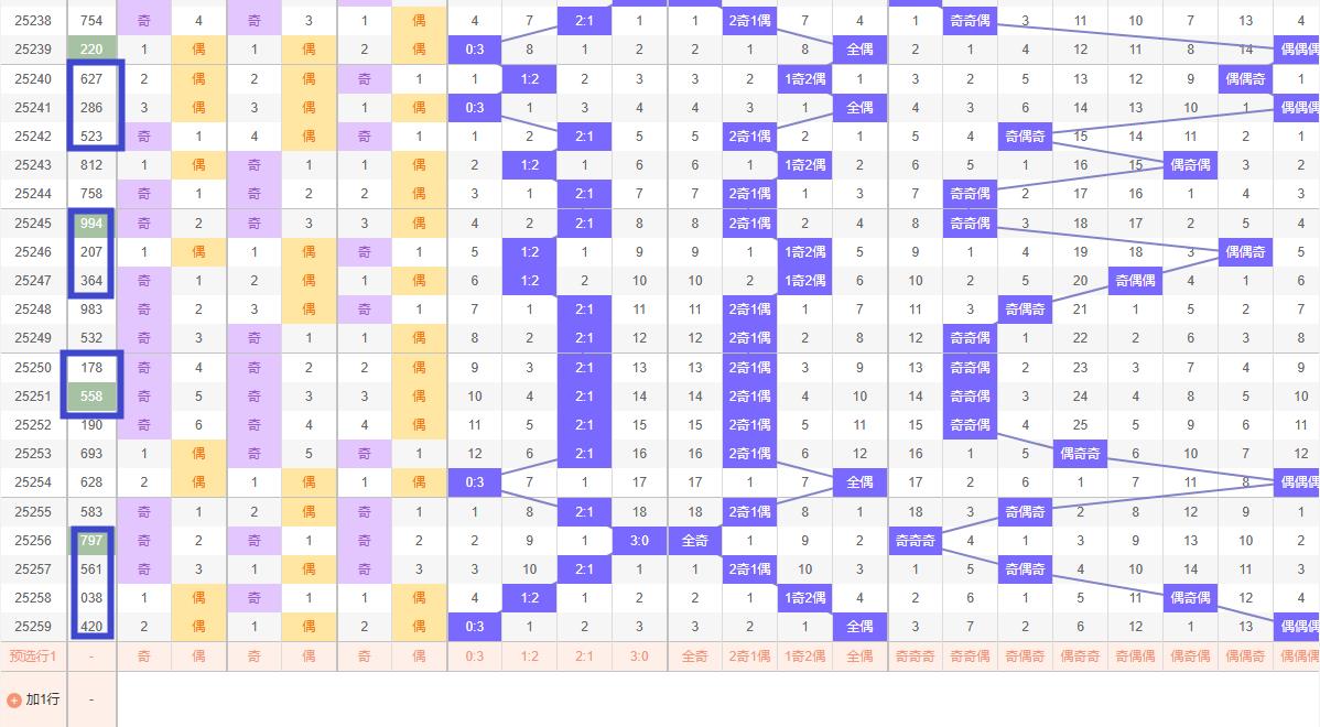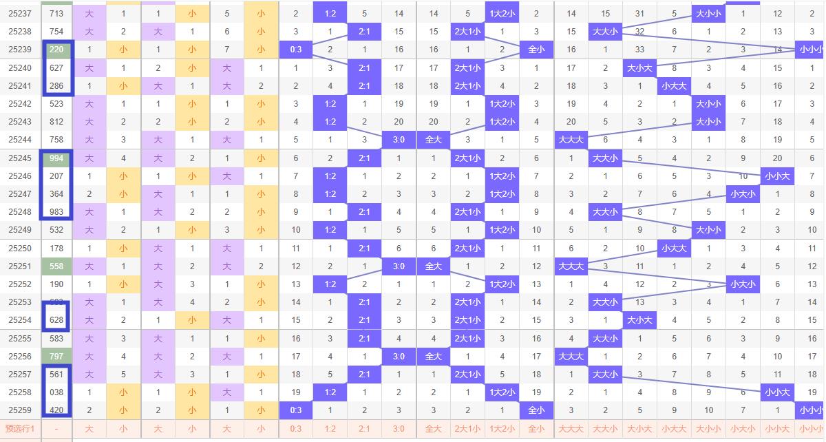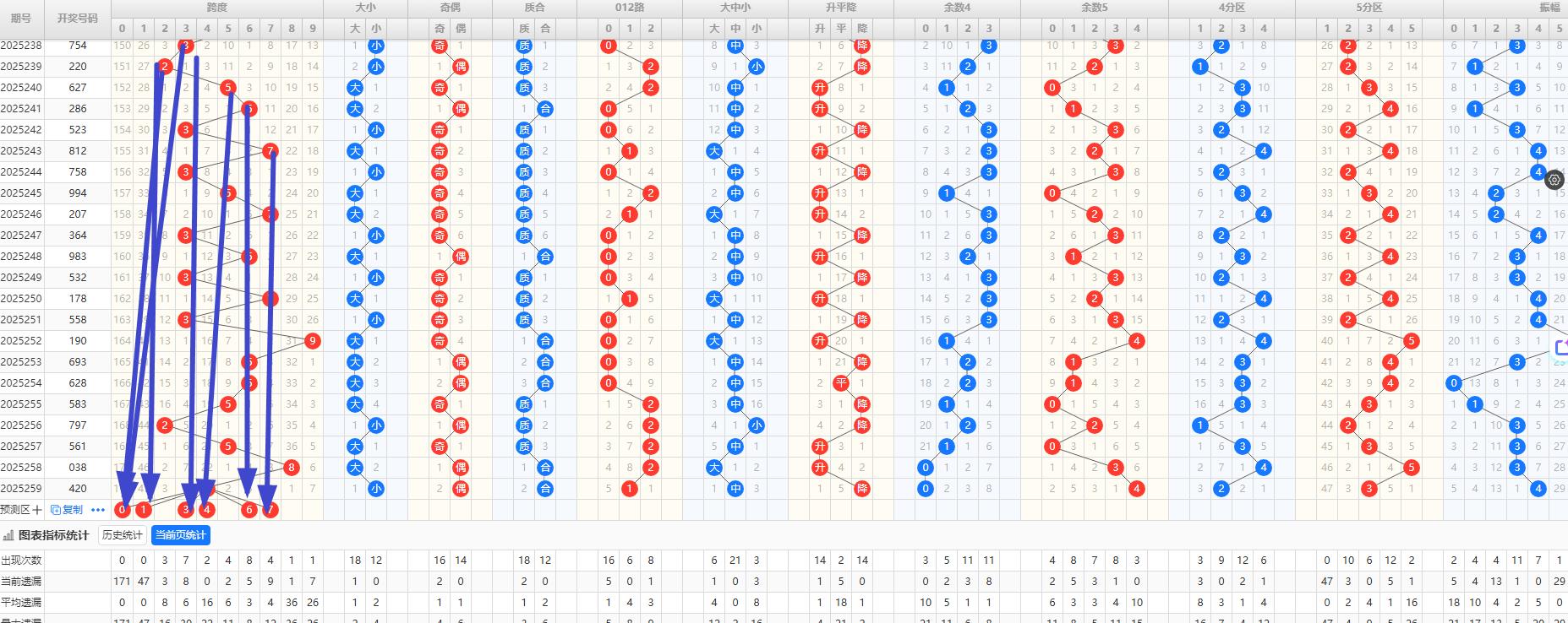 跨度预判 在259期中,开奖号码为420的跨度为4,属于中等较小的跨度值。近10期的跨度比为7-3-9-6-6-5-2-5-8-4,且012路的比例为4:2:4,基于这一分析,建议在第260期中重点关注1路0路的跨度的表现,同时看好偶数跨度的可能性。因此,推荐跨度值为0.1.3.4.6.7..这些跨度值在近期内具有较高的出现概率。尤其是0.1.跨可做为单挑和值的跨度。