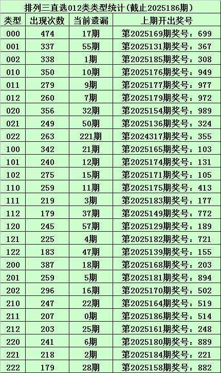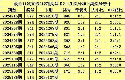 上期回顾:体彩排列三第2025186期开出奖号:514,其012路比为0:2:1,奖号012路类型为:211。