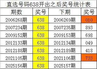 从上表统计可以看出,直选号码638开出之后,其下期奖号: