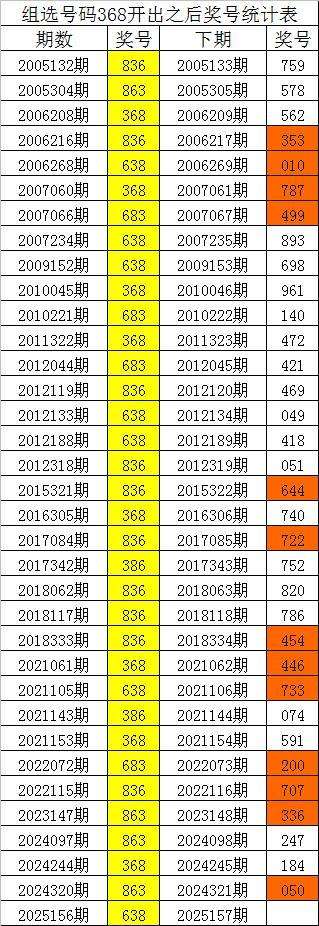 从上表可以看出,组选号码368开出之后,出现次数最多的三个号码分别为:470,本期防这三码中落号;出现次数最少的三个号码分别为:368,本期预计这三个号码不会同时出现,本期杀一码:3。
