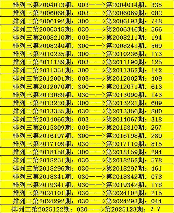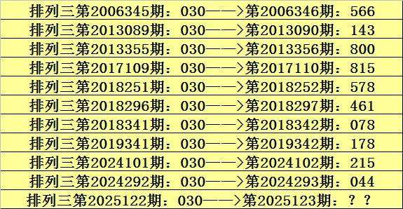 第2025122期排列三奖号为030,历史上该号码直选出现11次,下期奖号分别为:566、143、800、815、578、461、078、178、215、044。