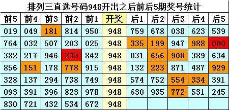 四、排列三直选号码948历史上开出7次,其前后五期奖号分别为: