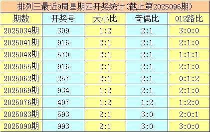 三、体彩排列三前9周星期四奖号分别开出:309-916-570-916-257-934-407-593-993,其中号码012路比为16:7:4,奇偶比为19:8,大小比为15:12;