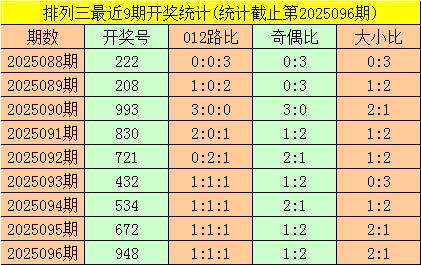 一、排列三第2025096期开出号码948,其奇偶比为1:2,大小比为2:1,号码012路比为1:1:1。该号码直选历史上出现了7次。