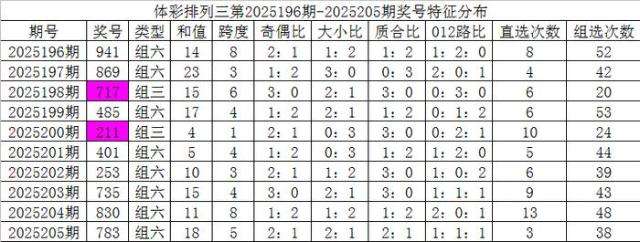 开奖公告:体彩排列三第2025205期开出奖号:783。组六,有重号:3、8,奇偶比2:1,大小比2:1,012比1:1:1,和值18,跨度5。