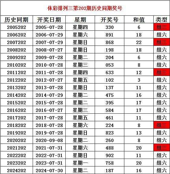 2025年7月31日排列三第202期开奖,历史同期分别开出奖号: