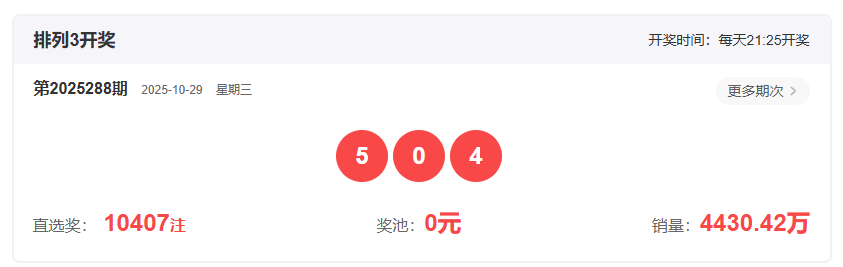 体彩排列3第2025288开奖号码504,形态为组六,奇偶比2:1,和值9,跨度5,大小比1:2,【012】路个数比1:1:1。