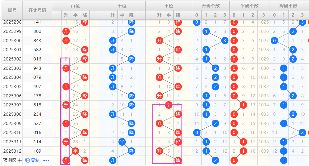 【排列3个位】:近十期升降走势为:降-升-平-降-升-降-降-升,为一种单一加重复性的交错走势,结合走势图可以看出,图中紫色框圈出为一种M形态的出球方式,本期可以重点看好升的形态号码的开出。