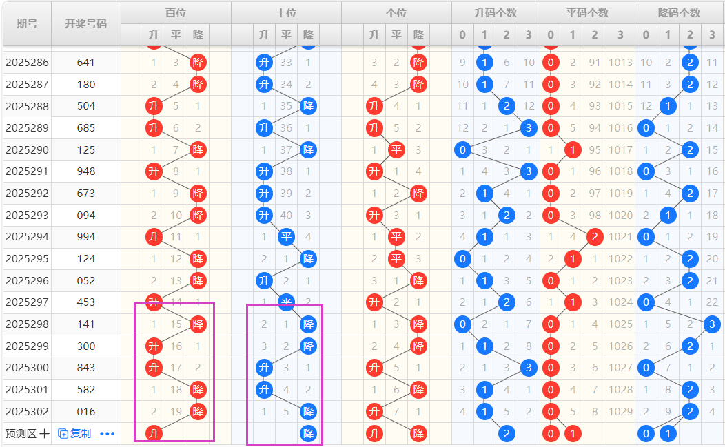 【排列3个位】:近十期升降走势为:升-降-降-升-降-升,为一种单一加重复性的交错走势,结合走势图可以看出,图中紫色框圈出为一种M形态的出球方式,本期可以重点看好升的形态号码的开出。