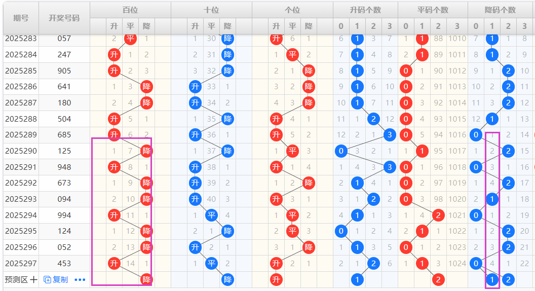 【排列3个位】:近十期升降走势为:升-降-升-平-平-降-升,为一种单一加重复性的交错走势,结合走势图可以看出,图中紫色框圈出为一种M形态的出球方式,本期可以重点看好升的形态号码的开出。