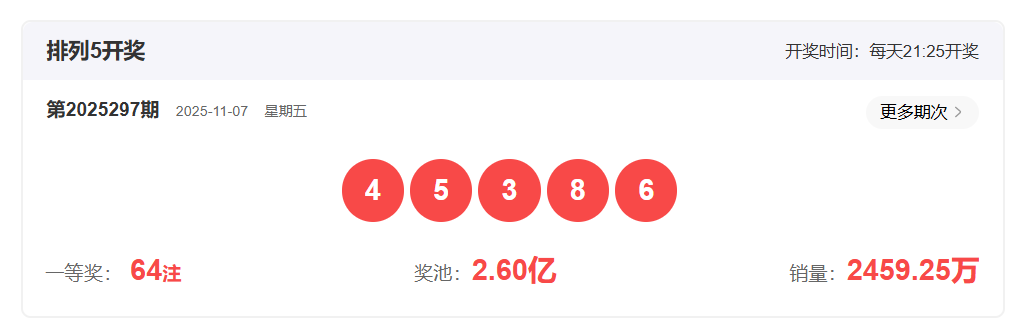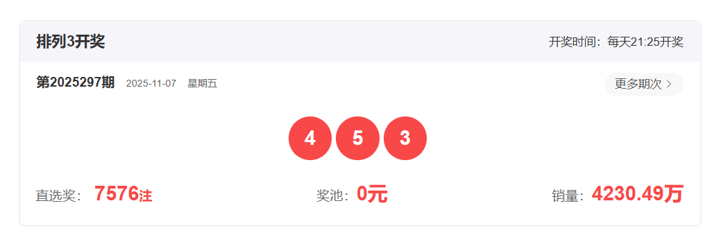 体彩排列3第2025297开奖号码453,形态为组六,奇偶比2:1,和值12,跨度2,大小比1:2,【012】路个数比1:1:1。