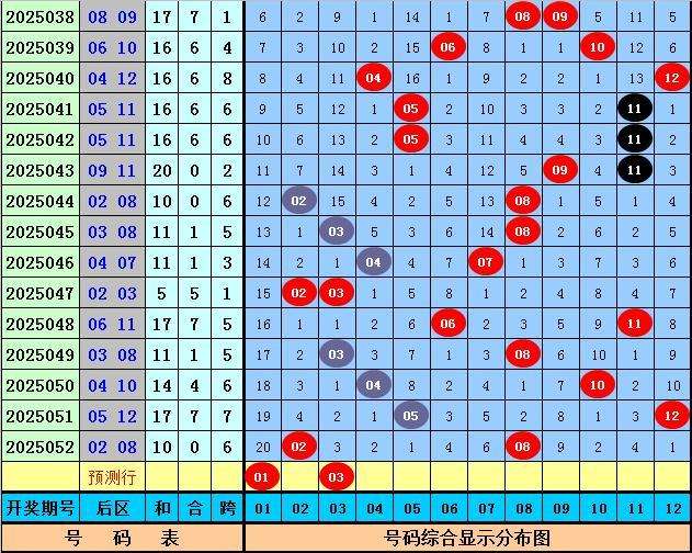 后区奖号分析:上期后区开出奖号02+08,奖号和值为10,跨度为6,本期预计后区和值转小,关注两码01 03。