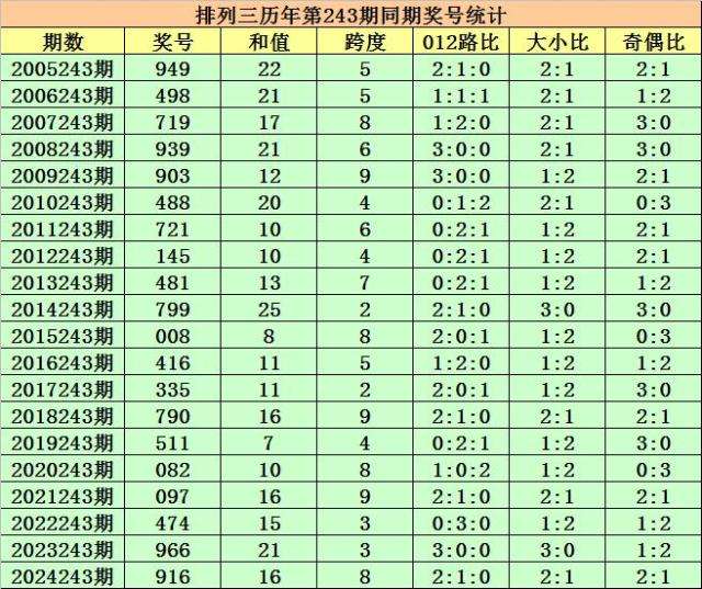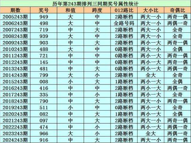 历史上第2025243期排列三已开出20期奖号了,历年同期奖号分别为:949、498、719、939、903、488、721、145、481、799、008、416、335、790、511、082、097、474、966、916,详细统计见下表: