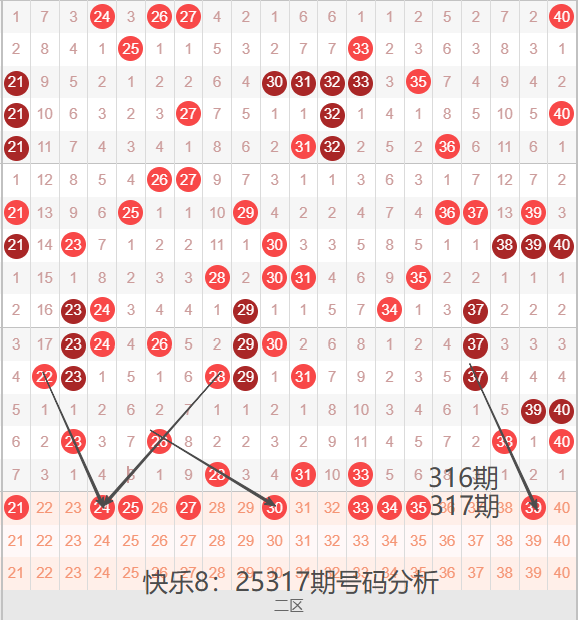 二区间21-40号码球走势,如下图: