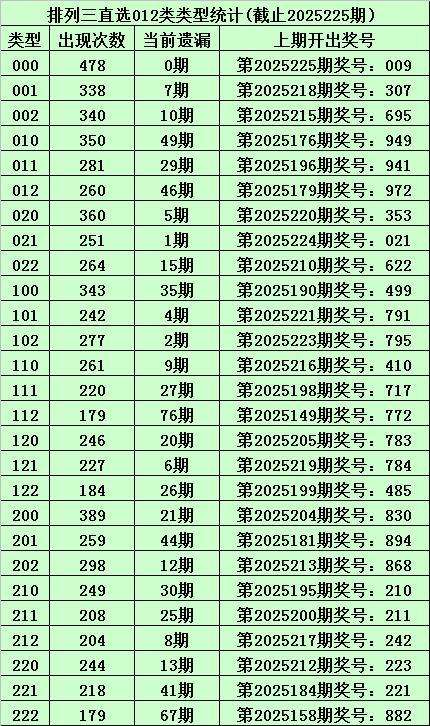 上期回顾:体彩排列三第2025225期开出奖号:009,其012路比为3:0:0,奖号012路类型为:000。