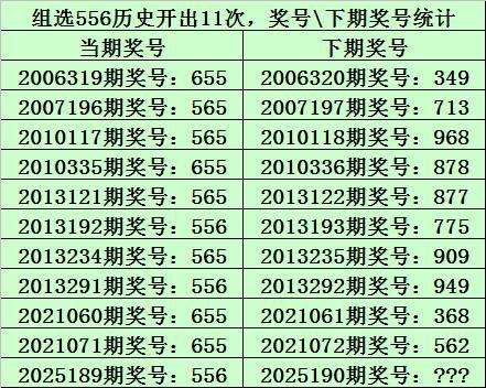 上期回顾:排列三第2025189期奖号为:556,类型:组三,历史上直选号码556出现了3次,组选号码556出现了11次。