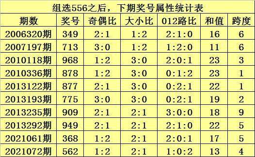 二、组选556分析:排列三历史上已开出11次组选号码556了,其奖号和下期开出奖号统计如下: