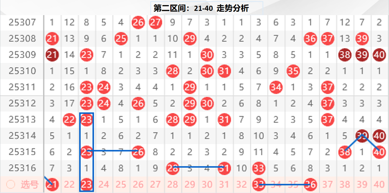 二区分析:【21-40】(走势图标注号码非小黄车大底,请谨慎参考,具体思路将在直播间分享讨论)