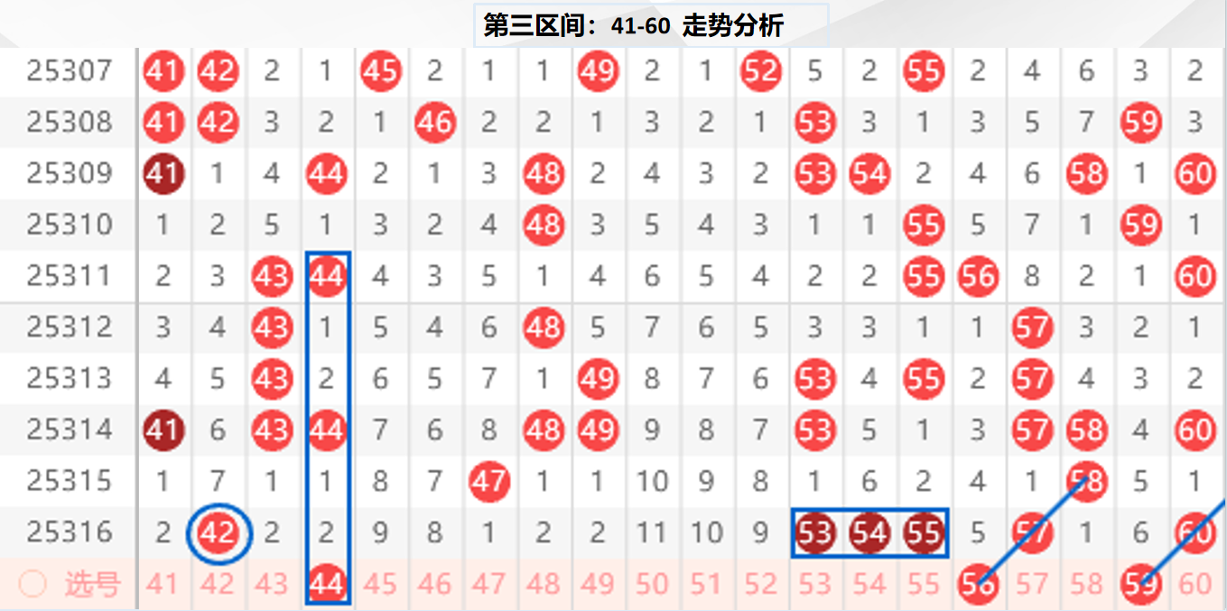 三区分析:【41-60】(走势图标注号码非小黄车大底,请谨慎参考,具体思路将在直播间分享讨论)