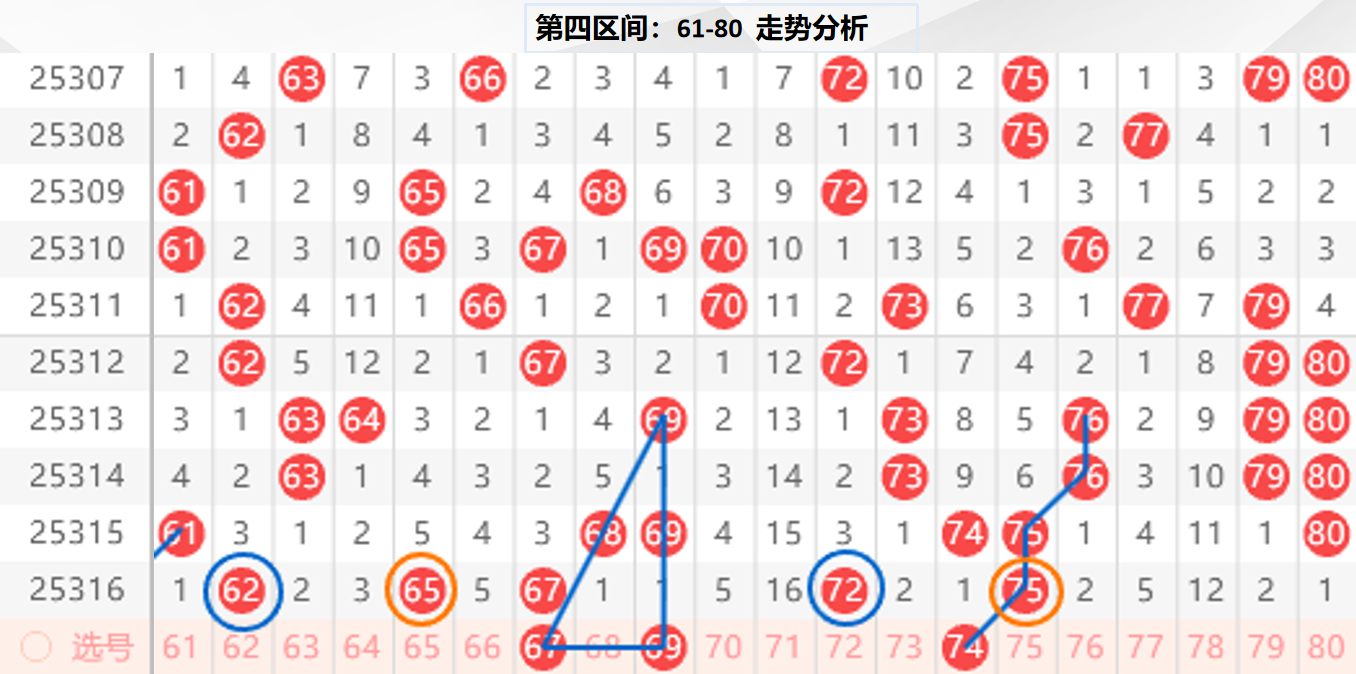 四区分析:【61-80】(走势图标注号码非小黄车大底,请谨慎参考,具体思路将在直播间分享讨论)