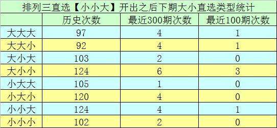2。在前9次直选【小小大】组合之后,下期开奖号码分别为:993-588-192-317-766-724-514-921-784,组三包含3期,组六包含6期。本期奖号排除对子,看好开出组六。